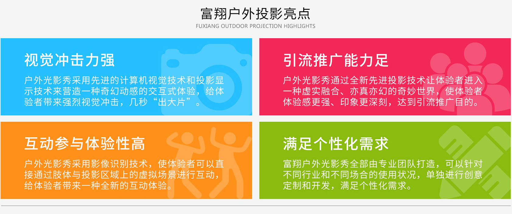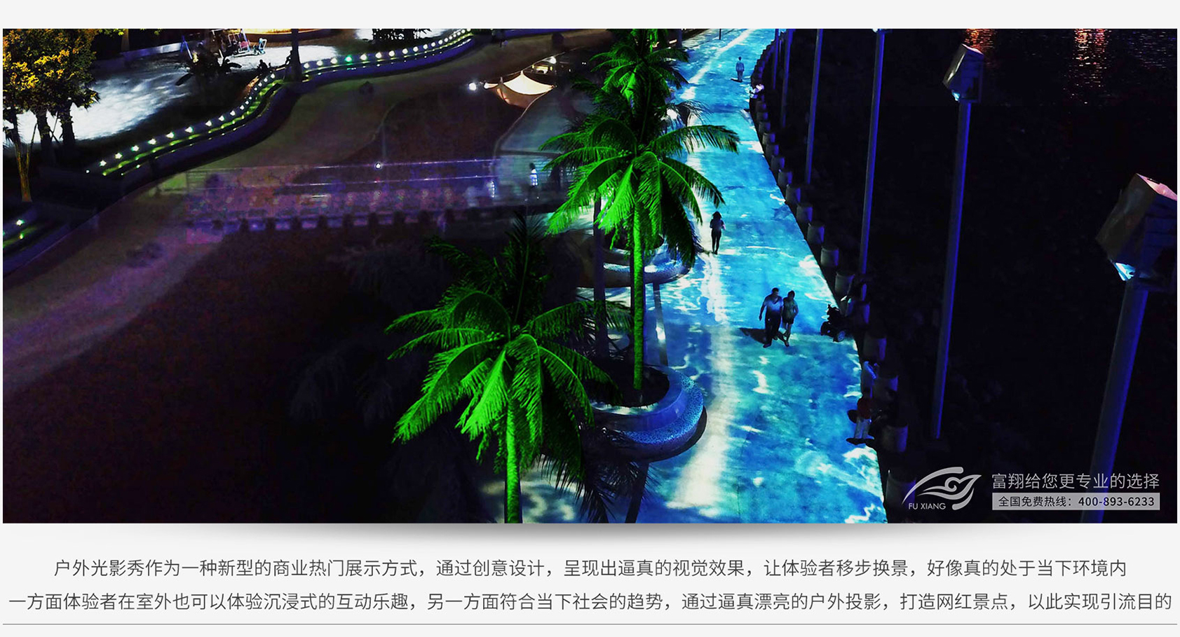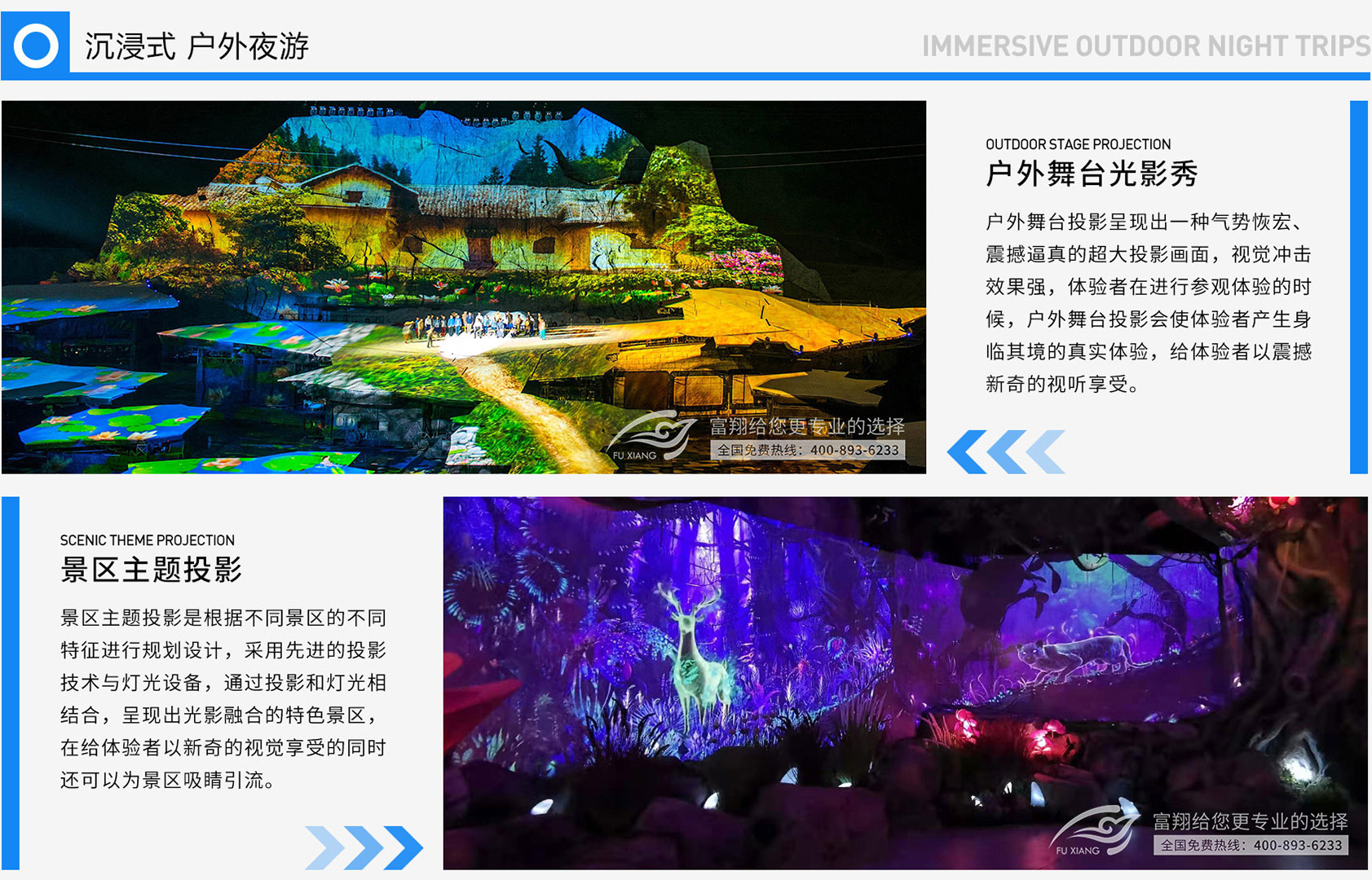 户外光影秀又可以叫做沉浸式夜游,,,,是通过数字内容的创意设计,,,,使湖光山色、、、花鸟虫鱼、、、宇宙太空等逼真的视觉效果以投影方式呈现,,,让体验者仿佛身临其境,,给体验者带来完全不一样的新鲜乐趣体验。。。