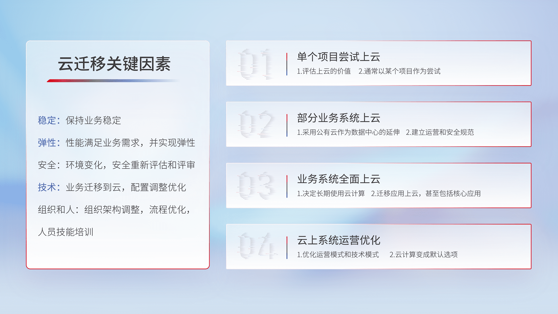 结合实际业务,,从规划设计、、、云平台选型、、、、云原生改造、、数据迁移、、、集成交付,,,迁移全过程为客户识别最佳上云路径,,,做好风险识别管理,,设计网络架构、、身份权限、、安全审计合规、、操作审计、、、、日志审计、、、、监控告警策略、、多站点容灾设计等,,,对云上基础设施进行整体规划,,,,提升IT治理水平,,,以满足弹性、、、、高可用、、、、高性能的需求。。