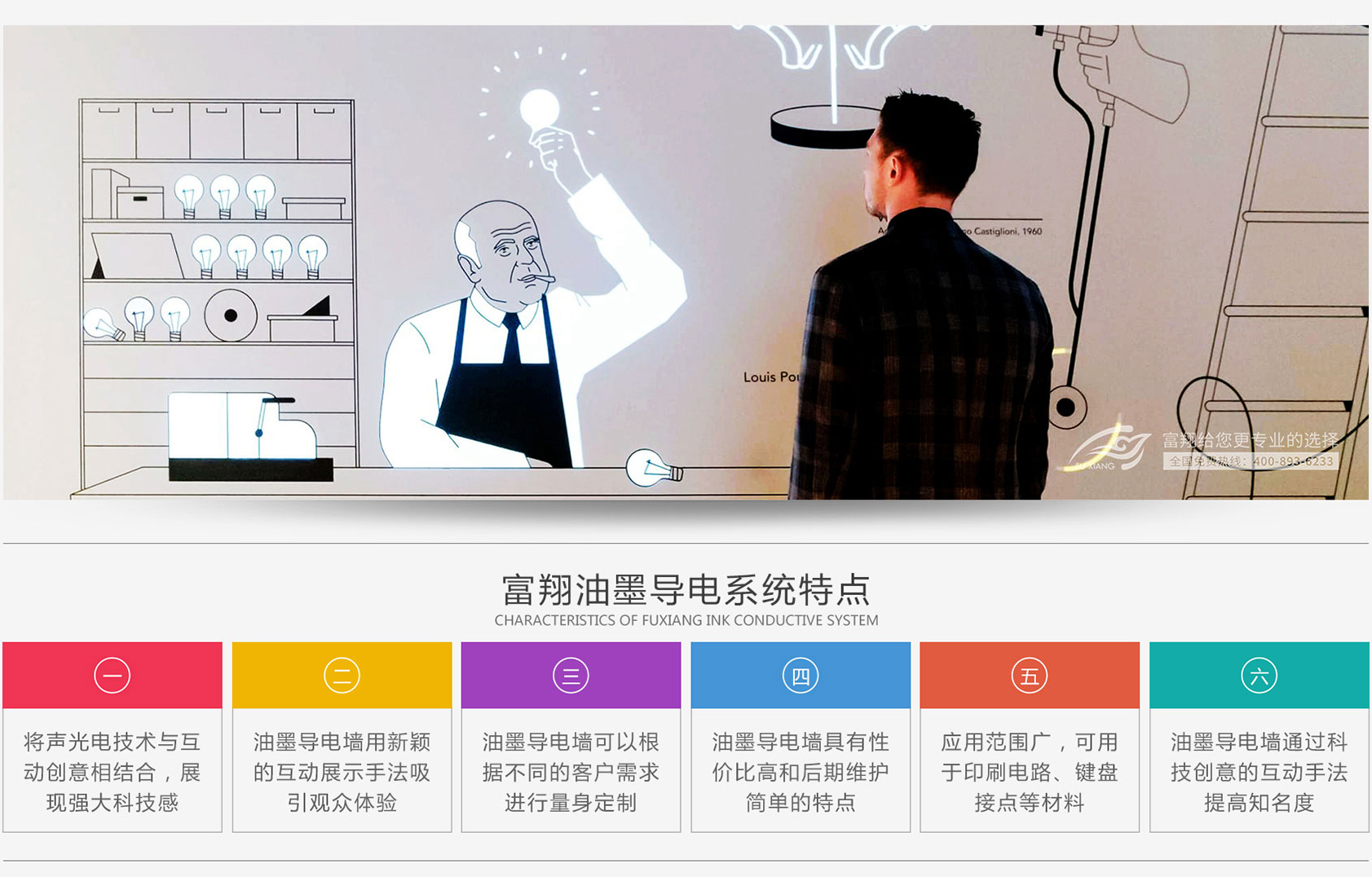 油墨导电是用导电材料分散在连结料中制成的糊状油墨,,,具有一定程度导电性质,,可作为印刷导电点或导电线路之用,,,油墨导电互动墙就是一面糅合了绘画和影像,,,利用电容式感应、、、接近感应技术的新型多媒体互动墙,,,它通过近距离触控识别,,触发影像系统在观众和展台之间产生交互和互动。。